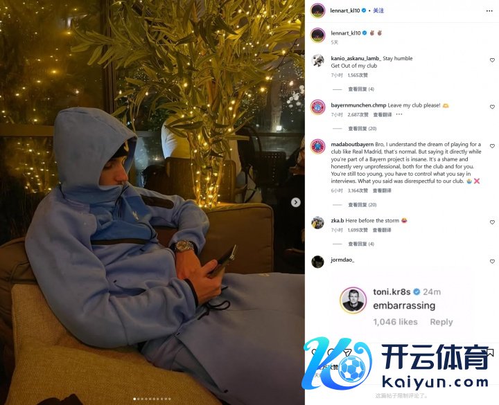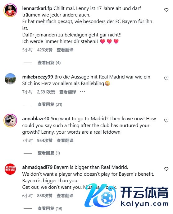 01月05日讯 17岁的拜仁新星卡尔在出席当作时公开暗示将来念念去皇马,这在德国足坛激励强大反响,现在卡尔的社媒驳倒区依然被月旦声占领。