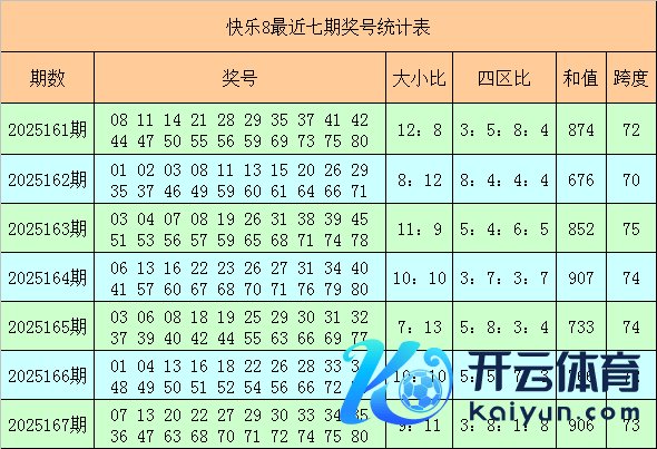 福彩欣慰8第2025167期开出奖号:07 13 20 22 27 29 30 33 34 35 36 47 63 68 70 71 72 74 75 80,其中奖号大小比为9:11,四区比为3:8:1:8,和值为906体育录像/图片,跨度为73。