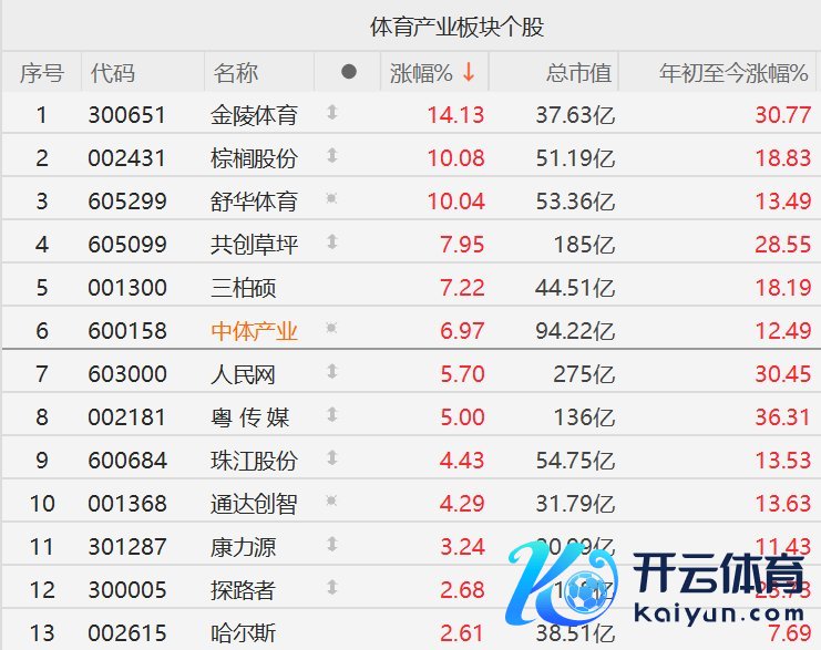 格隆汇1月21日|A股市集体育产业股走强,其中,金陵体育涨超14%,棕榈股份、舒华体育10CM涨停,共创草坪、三柏硕涨超7%,中体产业涨近7%,东说念主民网、粤传媒涨超5%,珠江股份、解析创智涨超4%。音尘面上,U23国足3比0打败越南队,历史初度晋级亚洲杯决赛,激发市集热议。
