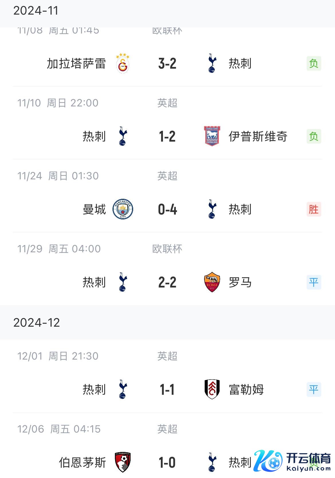 热刺各赛事近6场1胜2平3负,唯独赢球的是客场4-0曼城。
