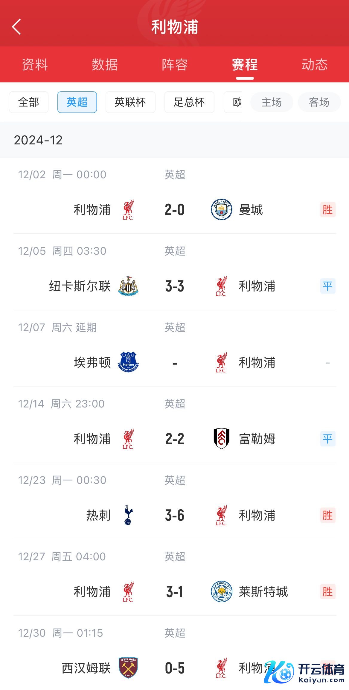 利物浦昔日六轮联赛赛果↓