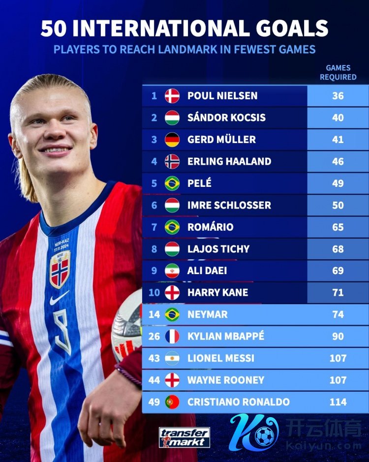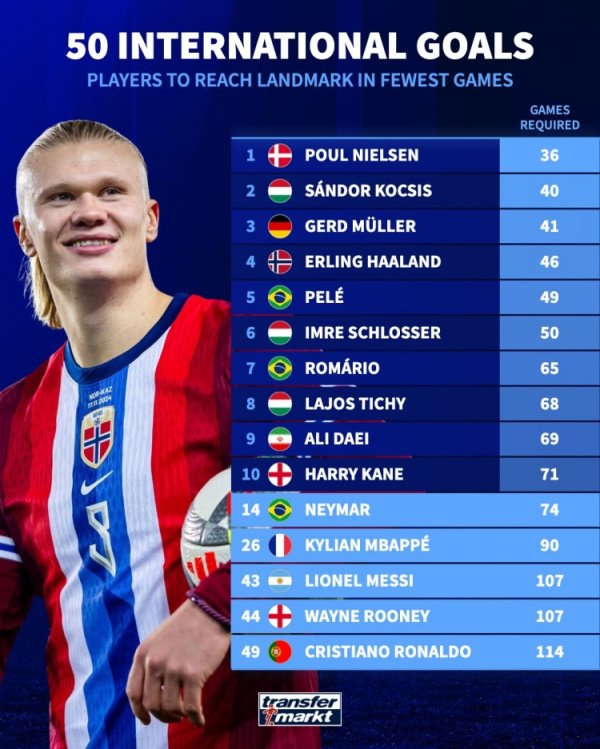 10月13日讯 在上周对阵以色列的世初赛中,哈兰德献艺帽子戏法,这让他成为历史上第4快打入国度队第50球的球员。算作对比,梅西用了107场才达到这一里程碑,而C罗则用了114场。德转列出了终端国度队50球所用场次最少的球员。