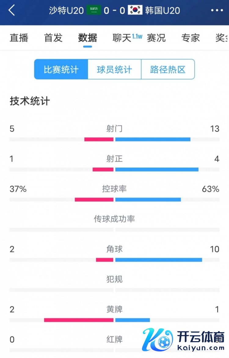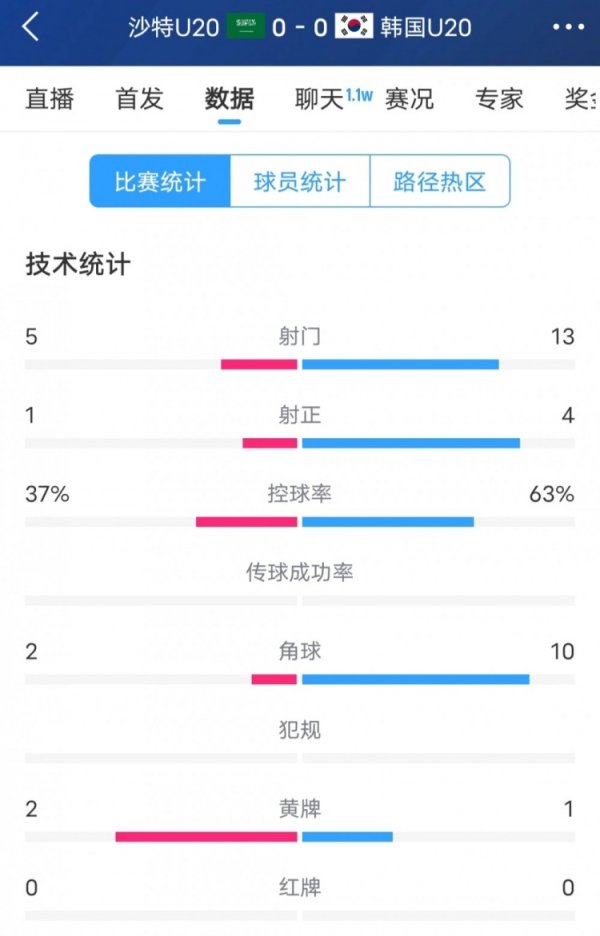 全场统计数据清晰体育赛事直播,韩国队13次射门4次射正,控球率为63%,沙特队则是5次射门1次射正,控球率37%。角球方面,韩国队多达10次,沙特惟一2次。