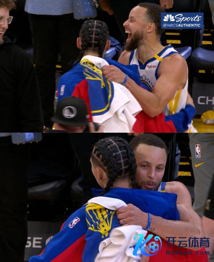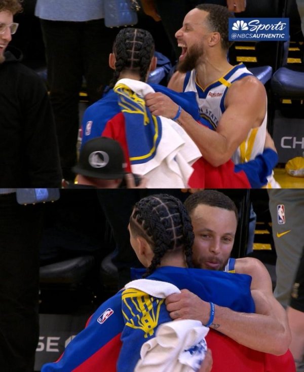 赛后,库里和前队友林迪-沃特斯三世拥抱问候。