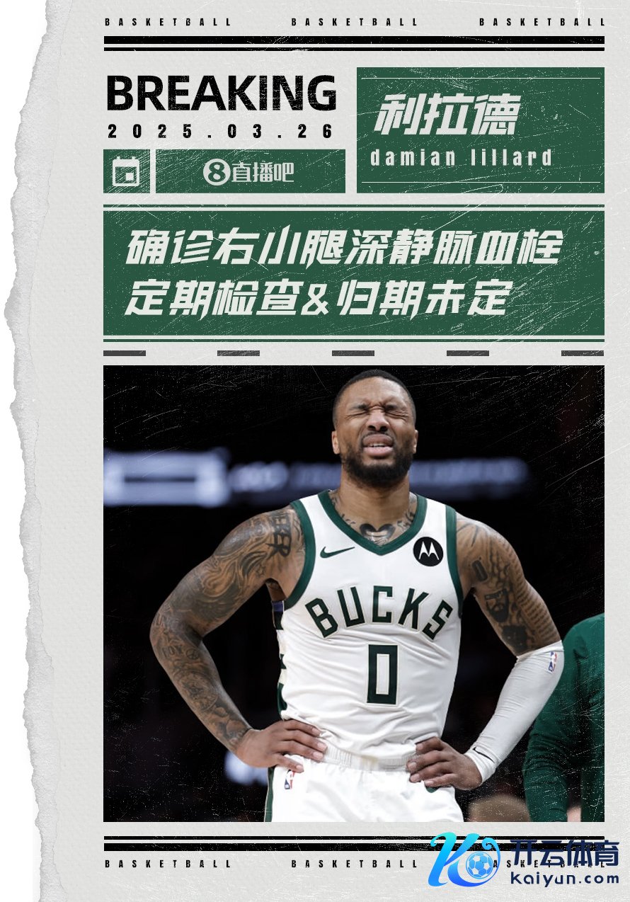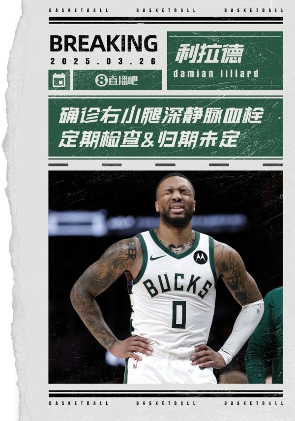 03月26日讯 名记Shams报谈,雄鹿后卫利拉德确诊为右小腿深静脉血栓(DVT)将无穷期休战。
