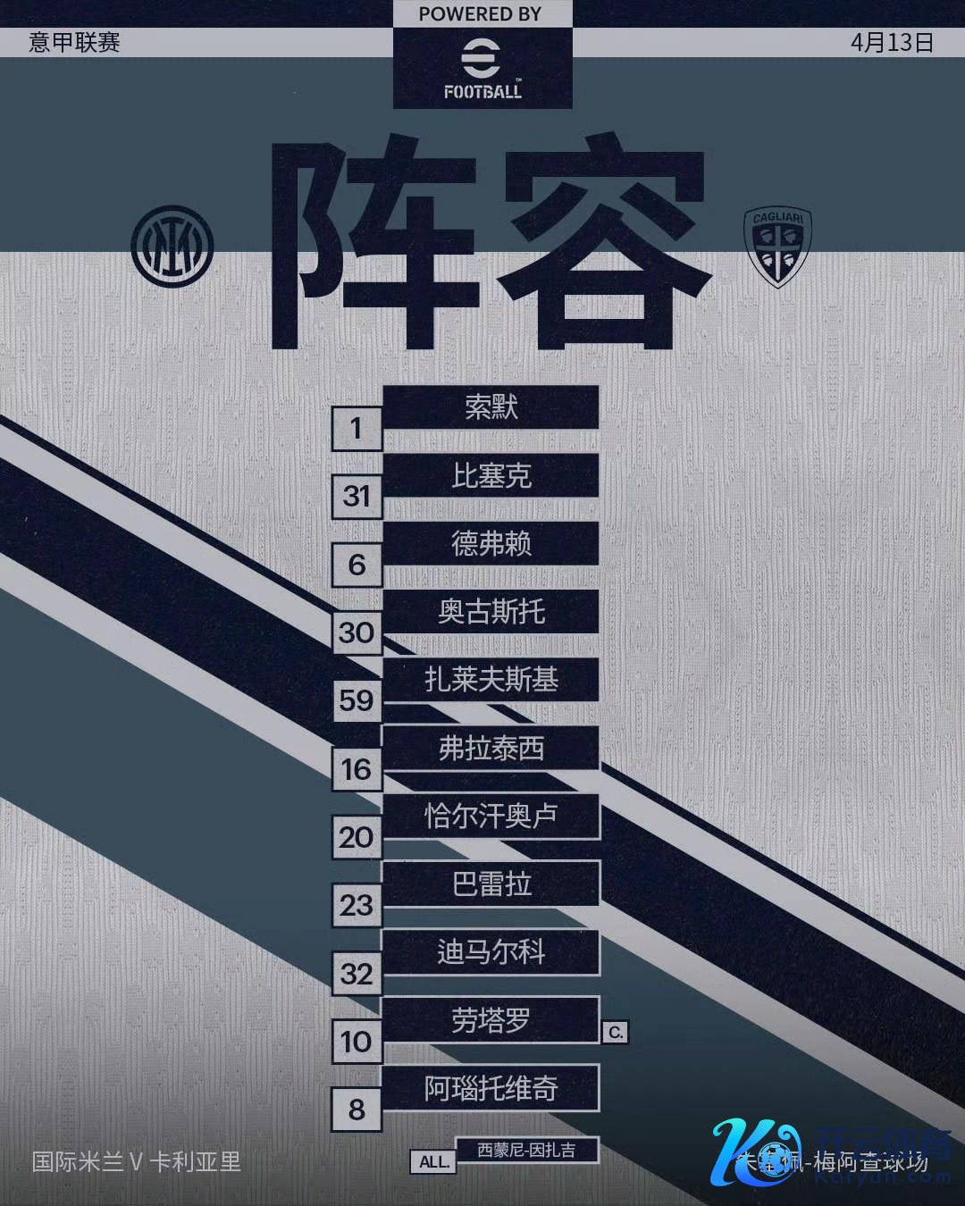 北京时辰4月13日00:00,意甲 第32轮,国外米兰主场迎战卡利亚里,赛前两边球队首发名单公布如下: