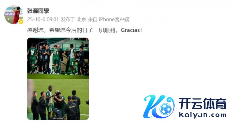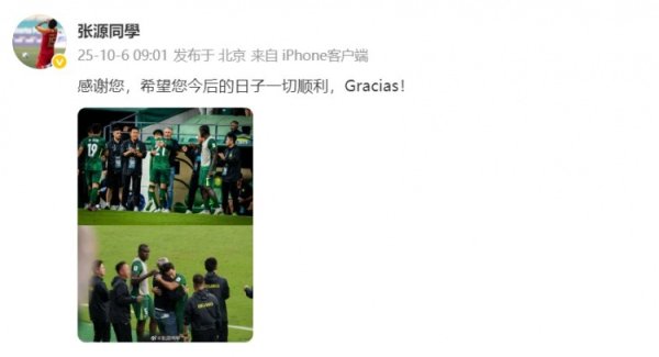 10月6日讯 昨晚,北京国安俱乐部官方通告主帅塞蒂恩离任。国安球员张源更新个东谈主微博,向塞蒂恩奉上祝愿。