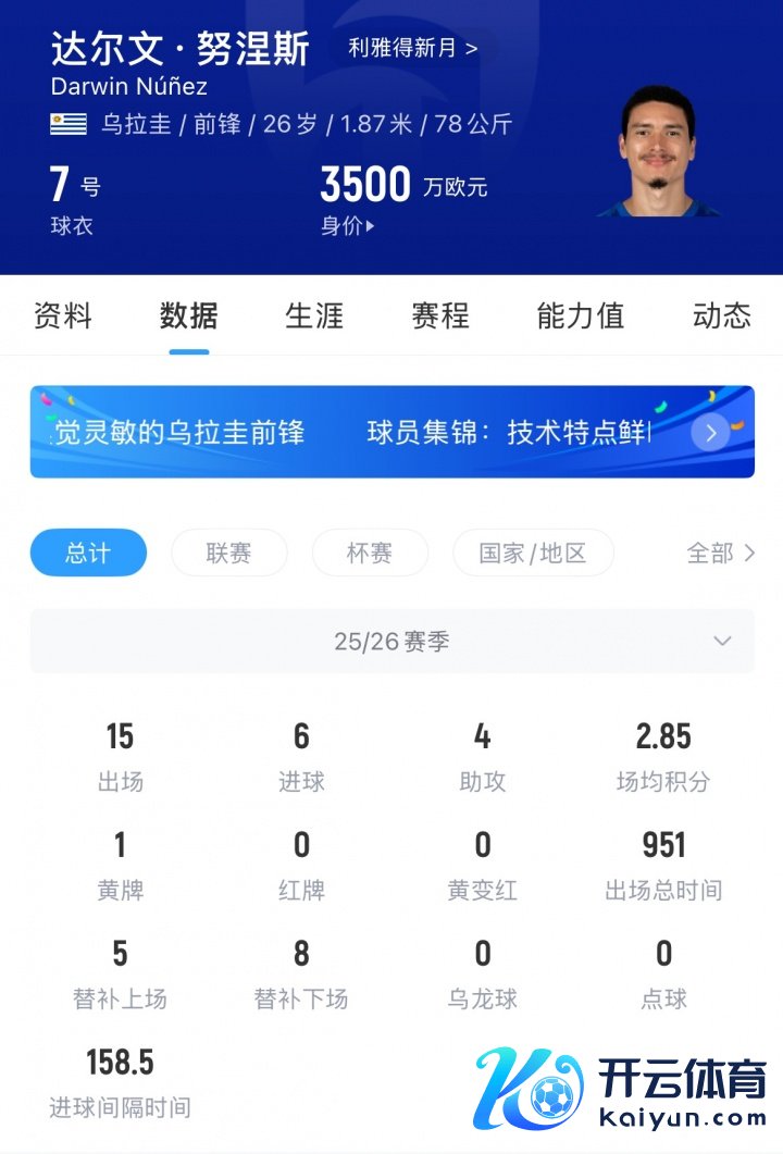 努涅斯客岁夏窗以5300万欧的转会费离开利物浦转投月牙,于今26岁的他已代表球队出战15场孝敬6球4助攻。