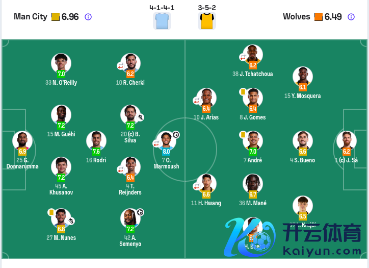曼城首发:25-多纳鲁马、27-努内斯、45-胡桑诺夫、15-格伊、33-奥赖利、16-罗德里、20-B席、4-赖因德斯(61’47-福登)、42-塞梅尼奥、10-谢尔基(73’11-多库)、7-马尔穆什(73’9-哈兰德)。